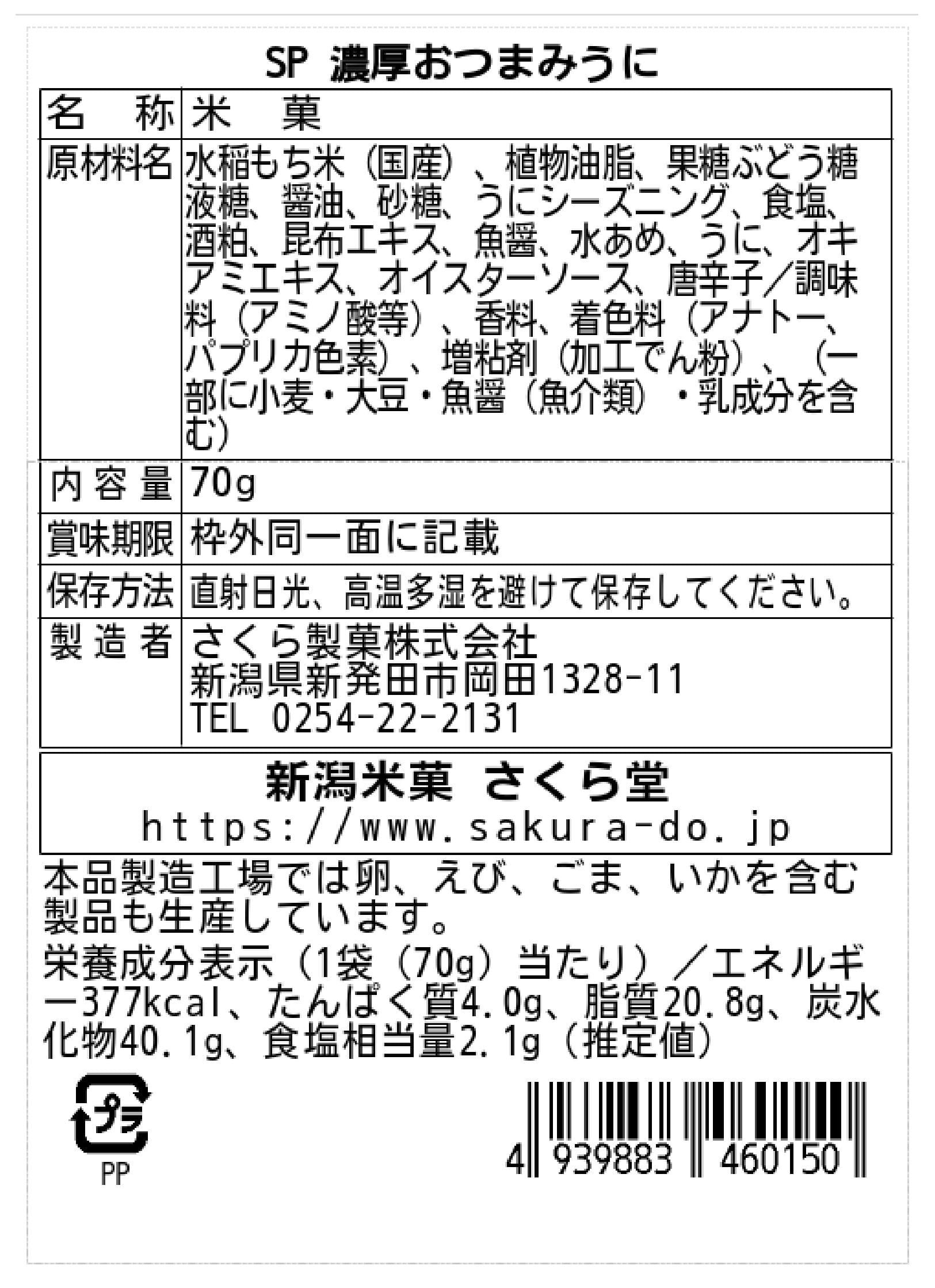 水稲うるち米(新潟県産)、植物油脂、加糖ぶどう糖液糖、醤油、砂糖、うにシーズニング、食塩、酒粕、昆布エキス、魚醤、水あめ、うに、オキアミエキス、オイスターソース、唐辛子/調味料(アミノ酸等)、香料、着色料(アナトー、パプリカ色素)、増粘剤(加工でん粉)、(一部に小麦・大豆・魚醤(魚介類)・乳成分を含む)