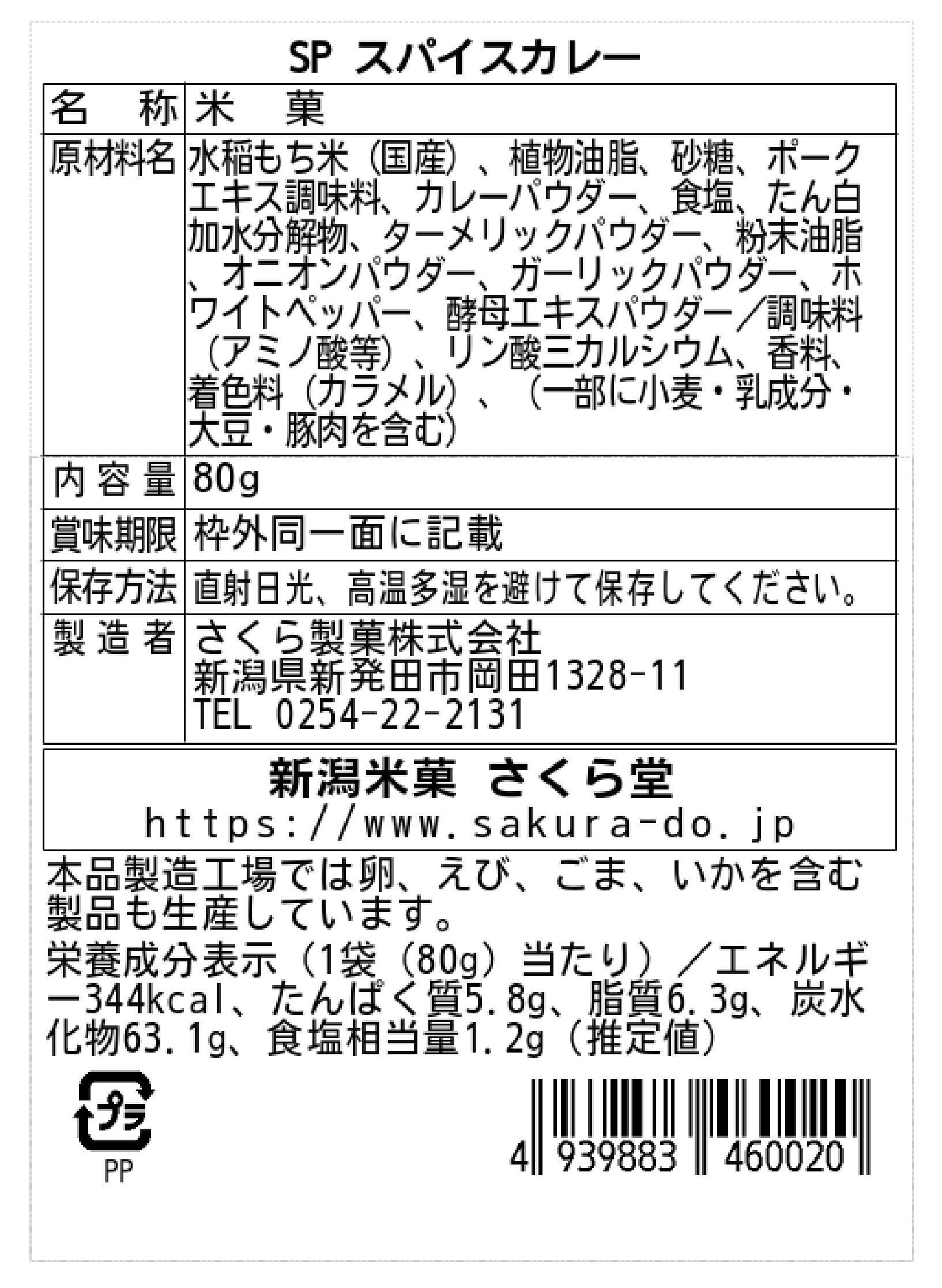 水稲もち米(新潟県産)、植物油脂、砂糖、ポークエキス調味料、食塩、カレーパウダー、たん白加水分解物、粉末油脂、ターメリックパウダー、ガーリックパウダー、オニオンパウダー、ホワイトペッパー、酵母エキスパウダー/調味料(アミノ酸等)、香辛料抽出物、カラメル色素、香料、(一部に大豆・小麦・豚肉・乳成分を含む)