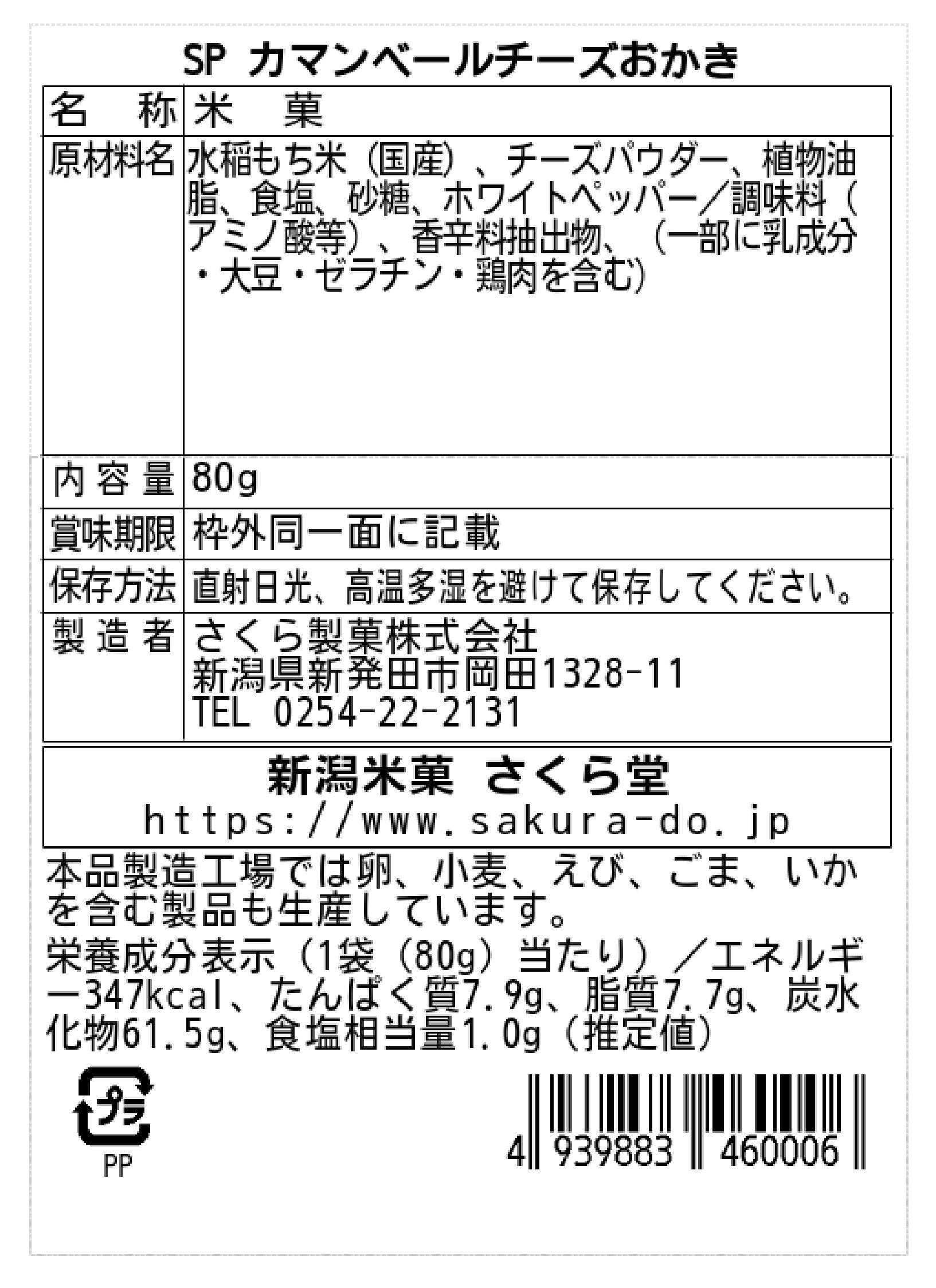 水稲もち米(新潟県産)、チーズパウダー、植物油脂、食塩、砂糖、ホワイトペッパー/調味料(アミノ酸等)、香辛料抽出物、(一部に乳成分・大豆・ゼラチン・鶏肉を含む)